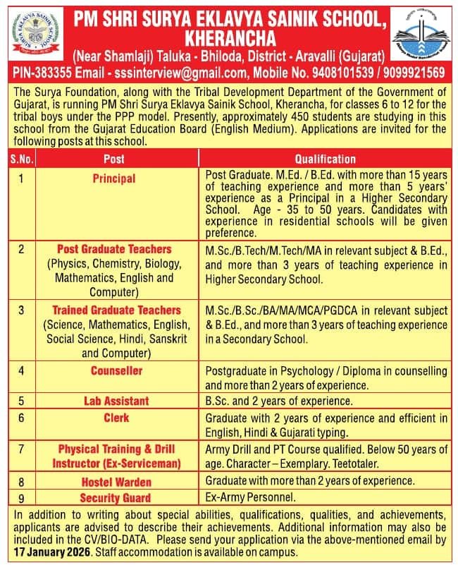 Eklavya Sainik School Recruitment: ગુજરાત રાજ્યના અરવલ્લી જિલ્લામાં આવેલ પીએમ શ્રી સૂર્યા એકલવ્ય સૈનિક સ્કૂલ, ખેરંચા ખાતે વર્ષ 2026 માટે વિવિધ શૈક્ષણિક અને પ્રશાસકીય પદો માટે ભરતી પ્રક્રિયા શરૂ કરવામાં આવી છે. આ શાળા ગુજરાત સરકારના આદિજાતિ વિકાસ વિભાગ અને સૂર્યા ફાઉન્ડેશન દ્વારા PPP મોડલ હેઠળ સંચાલિત થાય છે. આ સંસ્થા ધોરણ 6 થી 12 સુધીના આદિવાસી વિદ્યાર્થીઓને અંગ્રેજી માધ્યમમાં ગુણવત્તાપૂર્ણ શિક્ષણ સાથે શિસ્તબદ્ધ અને નિવાસી શાળા વાતાવરણ પૂરુ પાડે છે. હાલ આ શાળામાં આશરે 450 વિદ્યાર્થીઓ અભ્યાસ કરી રહ્યા છે. શિક્ષણ ક્ષેત્રે સેવા આપવા ઇચ્છુક અને અનુભવી ઉમેદવારો માટે આ એક ઉત્તમ તક છે.