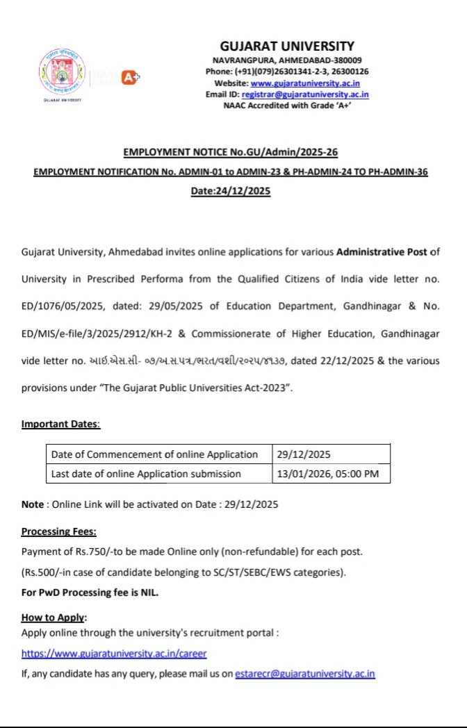 Gujarat University Recruitment: ગુજરાત યુનિવર્સિટી, અમદાવાદ (NAAC દ્વારા A+ ગ્રેડથી માન્ય) દ્વારા વર્ષ 2025–26 માટે યુનિવર્સિટીના વિવિધ વહીવટી (Administrative) પદો માટે લાયક ભારતીય નાગરિકો પાસેથી ઓનલાઈન અરજીઓ આમંત્રિત કરવામાં આવે છે. આ ભરતી ગુજરાત જાહેર યુનિવર્સિટીઓ અધિનિયમ–2023 તથા ઉચ્ચ શિક્ષણ વિભાગ, ગાંધીનગરના નિયમો અનુસાર કરવામાં આવશે. યુનિવર્સિટી વહીવટ અને શૈક્ષણિક સંચાલન ક્ષેત્રમાં કારકિર્દી બનાવવા ઇચ્છુક ઉમેદવારો માટે આ એક મહત્વપૂર્ણ તક છે.આ લેખમાં અમે પાત્રતા, પગાર, પસંદગી પ્રક્રિયા, અરજી પ્રક્રિયા અને અરજી ની પ્રકિયા વિશે સંપૂર્ણ વિગરવાર માહિતી આપીશુ તેથી ધ્યાન થી વાંચો.