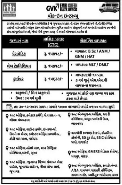 GVK EMRI Health Services Recruitment: જીવીકે ઇએમઆરઆઈ હેલ્થ સર્વિસીસ દ્વારા ગુજરાત સરકારની નોડલ એજન્સી તરીકે PPP મોડલ હેઠળ મોબાઈલ હેલ્થ યુનિટ, આરોગ્ય સંજીવની તથા ધન્વંતરી આરોગ્ય રથ જેવી મહત્વપૂર્ણ આરોગ્ય સેવાઓ ગુજરાતભરમાં ચલાવે છે. આ સેવાઓ માટે વિવિધ ટેક્નિકલ અને સપોર્ટ સ્ટાફની ભરતી વોક-ઇન ઇન્ટરવ્યૂ દ્વારા કરવામાં આવશે. આરોગ્ય ક્ષેત્રમાં સ્થિર નોકરી સાથે સમાજ સેવા કરવાની ઇચ્છા ધરાવતા ઉમેદવારો માટે આ એક સારી તક છે.