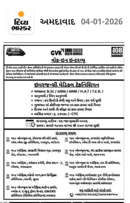 GVK EMRI 108 દ્વારા ઇમરજન્સી મેડિકલ ટેકનિશિયન પદ માટે વોક-ઇન ઇન્ટરવ્યૂ 06 જાન્યુઆરી 2026 ના રોજ યોજાશે. ઇન્ટરવ્યૂ સવારે 10:00 વાગ્યાથી બપોરે 2:00 વાગ્યા સુધી લેવામાં આવશે. ઉમેદવારોએ સમયસર ઇન્ટરવ્યૂ સ્થળે હાજર રહેવું ફરજિયાત રહેશે.