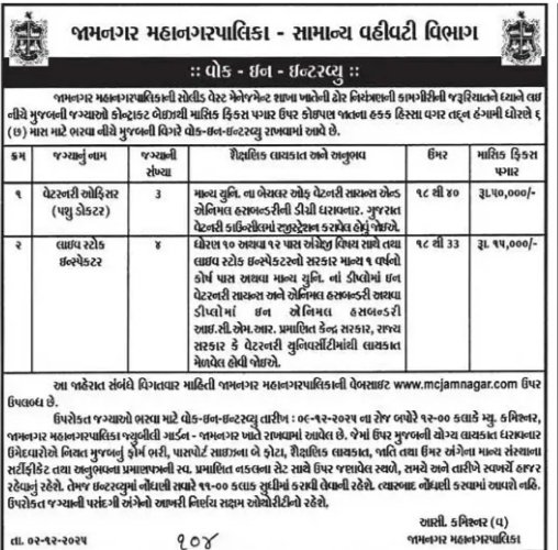 JMC Recruitment 2025: જામનગર મહાનગરપાલિકા ની સોલિડ વેસ્ટ મેનેજમેન્ટ શાખામાં ઢોર નિયંત્રણ કામગીરીને વધુ અસરકારક બનાવવા માટે હંગામી ધોરણે છ મહિનાની મુદત માટે કોન્ટ્રાક્ટ આધારિત ભરતી યોજવામાં આવી રહી છે. આ ભરતી ખાસ કરીને ઢોર સંભાળ અને વેટરનરી ક્ષેત્ર સંબંધિત ફરજો માટે છે. મહાનગરપાલિકા દ્વારા જાહેર કરાયેલી આ પસંદગી પ્રક્રિયા વોક-ઇન-ઇન્ટરવ્યુના આધારે થશે અને ઉમેદવારોને નિર્ધારિત તારીખે સ્થળ પર હાજર રહેવું રહેશે.