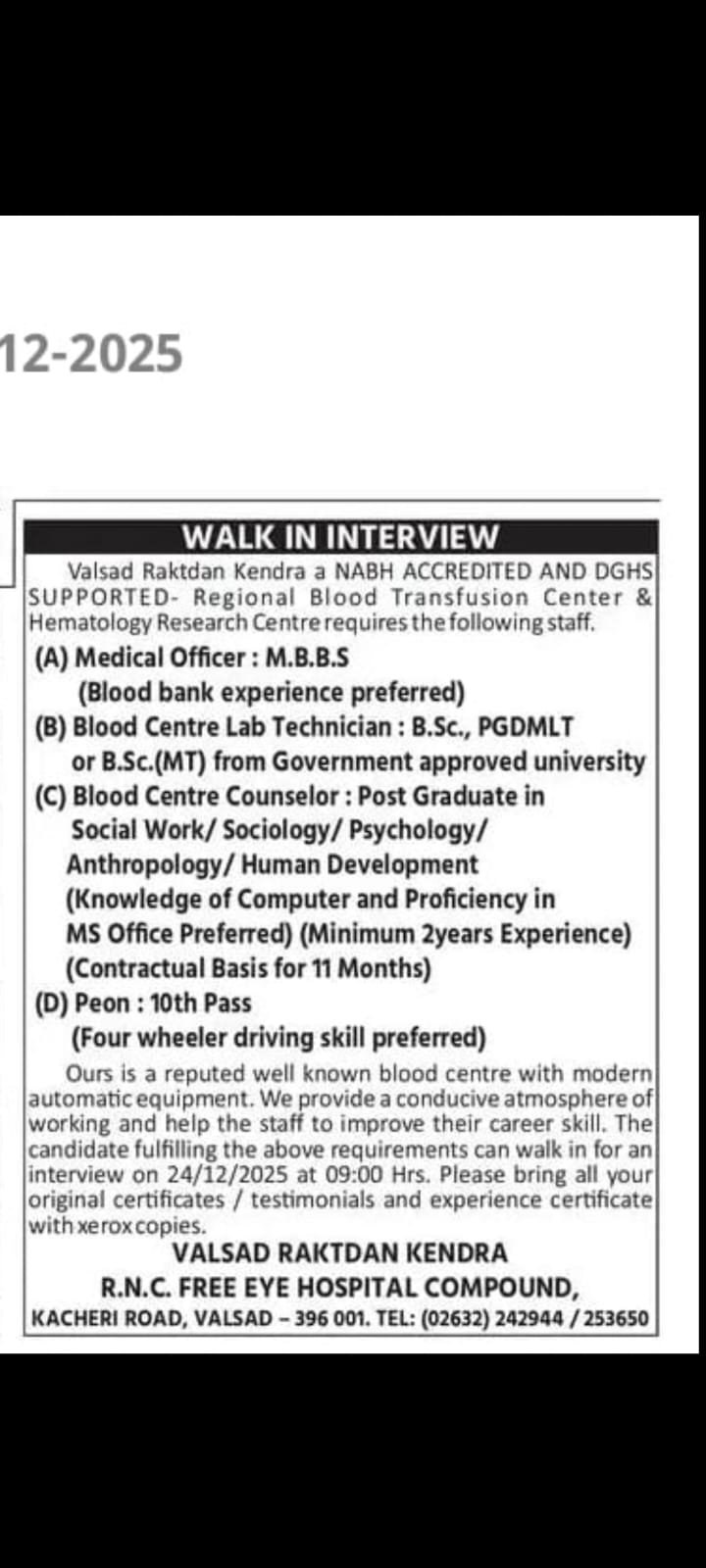 Medical Recruitment 2025: વલસાડ ખાતે કાર્યરત એક પ્રતિષ્ઠિત રીજનલ બ્લડ ટ્રાન્સફ્યુઝન સેન્ટર તથા હેમેટોલોજી રિસર્ચ સેન્ટર દ્વારા વર્ષ 2025 માટે કરાર આધારિત વિવિધ પદો માટે વોક-ઇન ઇન્ટરવ્યુનું આયોજન કરવામાં આવ્યું છે. આ સંસ્થા આધુનિક ઓટોમેટિક ઉપકરણો સાથે બ્લડ બેંક સેવાઓ પૂરી પાડે છે અને આરોગ્ય ક્ષેત્રમાં વિશ્વસનીય કામગીરી માટે જાણીતી છે. સંસ્થામાં કાર્ય કરનારા કર્મચારીઓને અનુકૂળ કાર્ય વાતાવરણ, વ્યવસાયિક વિકાસ અને કારકિર્દી સુધારવાની તક આપવામાં આવે છે. આરોગ્ય ક્ષેત્રમાં સેવા આપવા ઇચ્છુક લાયક ઉમેદવારો માટે આ ભરતી એક ઉત્તમ તક ગણાય છે.