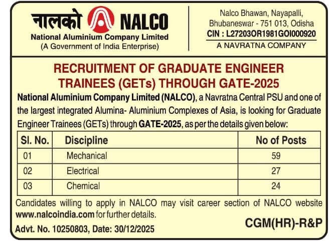 આ લેખ જાહેરમાં ઉપલબ્ધ માહિતીના આધારે તૈયાર કરવામાં આવ્યો છે. ભરતી સંબંધિત અંતિમ અને અધિકૃત માહિતી માટે ઉમેદવારોને NALCOની અધિકૃત વેબસાઇટ પર પ્રકાશિત સૂચનાનો અભ્યાસ કરવો જરૂરી છે. કોઈપણ ફેરફાર અથવા ભૂલ માટે સંબંધિત સંસ્થા જવાબદાર રહેશે.