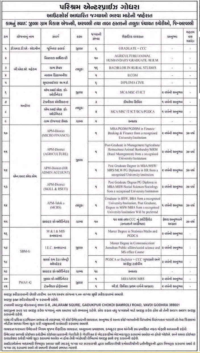 આ ભરતી માં પરિશ્રમ એન્ટરપ્રાઈઝ દ્વારા DRDA – Admin/Junior Clerk, Agriculture/Animal Husbandry Extension Officer, BLA મહેકમ/ગ્રામ સેવક, નાયબ હિસાબનીશ, સુપરવાઈઝર (A.M.E.), MIS Co-ordinator, ટેક્નિકલ આસિસ્ટન્ટ, Taluka MIS Co-ordinator, ગ્રામ રોજગાર સેવક, NRLM વિભાગના APM અને ક્લસ્ટર કો-ઓર્ડિનેટર, તેમજ PMAY-G વિભાગના ટેક્નિકલ પ્રોફેશનલ અને જિલ્લા કો-ઓર્ડિનેટર ના પદો માટે યોગ્ય ઉમેદવારોની પસંદગી કરવામાં આવશે. જેમાં કુલ 52 ખાલી જગ્યાઓ માટે આ જાહેરાત પ્રસિદ્ધ કરવામાં આવી છે. આ જગ્યાઓ પર ઉમેદવાર અરજી કરી શકે છે, અરજી કરતા પહેલાં ઉમેદવારોએ સત્તાવાર ભરતી સૂચના ધ્યાનપૂર્વક વાંચવી જરૂરી છે.