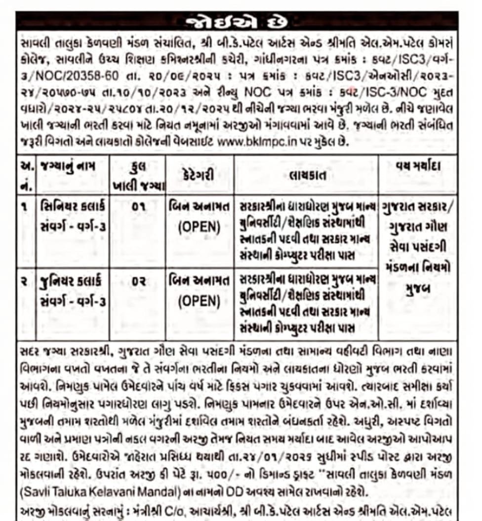 Savli Arts & Commerce Colleg Recruitment: ગુજરાત રાજ્ય માં સારી નોકરી શોધી રહેલા ઉમેદવારો માટે સાવલી તાલુકા કેળવણી મંડળ દ્વારા શ્રી બી.કે. પટેલ આર્ટસ એન્ડ શ્રીમતિ એલ.એમ. પટેલ કોમર્સ કોલેજ માં એક મહત્વપૂર્ણ ભરતી જાહેર કરવામાં આવી છે. સાવલી તાલુકા કેળવણી મંડળ દ્વારા નવી જગ્યાઓ ભરવા માટે અરજી મંગાવવામાં આવી છે. આ ભરતીમાં અનુકૂળ પગાર ધોરણ, પસંદગી પ્રક્રિયા અને અન્ય શરતો પણ જાહેર કરવામાં આવી છે. આ ભરતી કયા પદ માટે છે, કેટલી જગ્યાઓ છે, શું લાયકાત જોઈએ, તમામ માહિતી આજે આપણે આ લેખમાં સરળ અને સામાન્ય ભાષામાં વિગતવાર જાણીશું.
