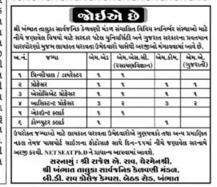Shri Khambhat Taluka Public Education Board Recruitment: શ્રી ખંભાત તાલુકા સાર્વજનિક કેળવણી મંડળ સંચાલિત વિવિધ સ્વનિર્ભર સંસ્થાઓમાં ખાલી પડેલ જગ્યાઓ માટે લાયકાત ધરાવતા અને યોગ્ય ઉમેદવારો પાસેથી અરજીઓ આમંત્રિત કરવામાં આવી રહી છે. સરદાર પટેલ યુનિવર્સિટી તથા ગુજરાત સરકારના પ્રચલિત ધોરણો અનુસાર જરૂરી શૈક્ષણિક લાયકાત ધરાવતા ઉમેદવારોને આ ભરતીમાં અરજી કરવાની તક આપવામાં આવી છે. NET, SEAT અને Ph.D ધરાવતા ઉમેદવારોને ખાસ પ્રાધાન્ય આપવામાં આવશે.